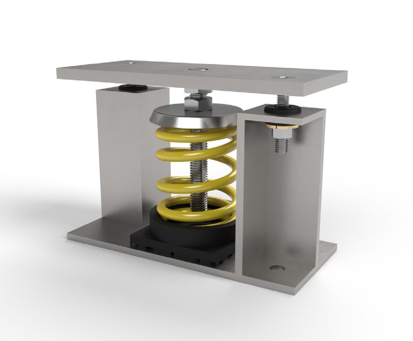 The RAMmount-S isolator is RAM‐ISO’s standard roof curb or floor‐mount isolator ideal for equipment with fluctuating operating weights. Designed to integrate with any roof curb or floor‐mounted piece of equipment, the VIBmount‐S isolator will aid to reduce the vibration from large mechanical and electrical equipment to the building structure. The RAMmount-S has integrated lateral and vertical restraints in order to account for seismic and wind loads. RAM‐ISO will engineer each RAMmount-S isolator to match your specified unit and meet any additional customer requirements. The RAMmount-S isolator is available in either 1” or 2” deflection and is shipped fully assembled with the springs and restraints installed at RAM‐ISO in order to reduce onsite labor requirements. The springs are made of structural steel and sit on an elastomeric mount. The housing is made entirely of structural steel. On site, the RAMmount-S design allows for quick assembly requiring only basic tools for installation.